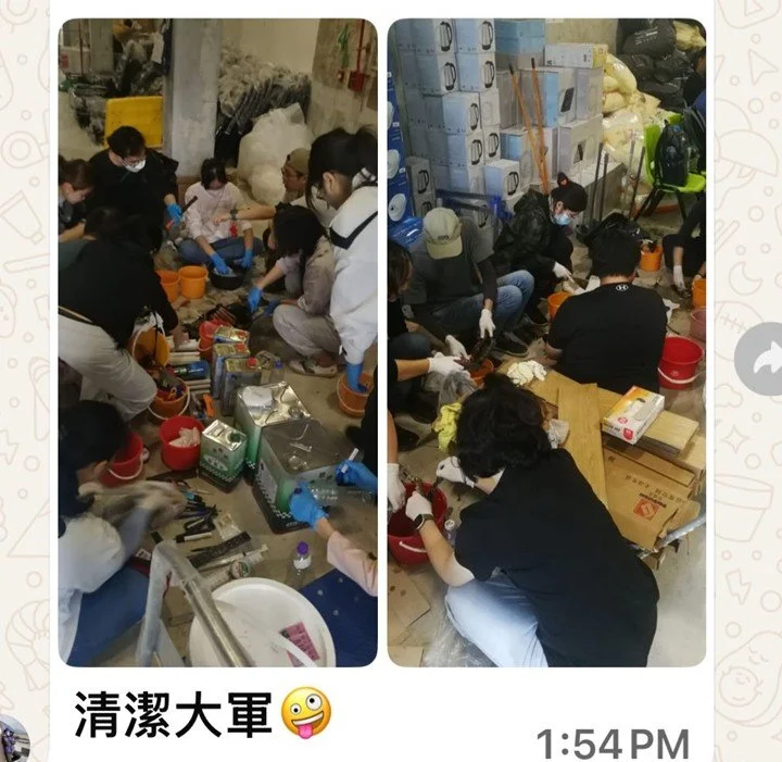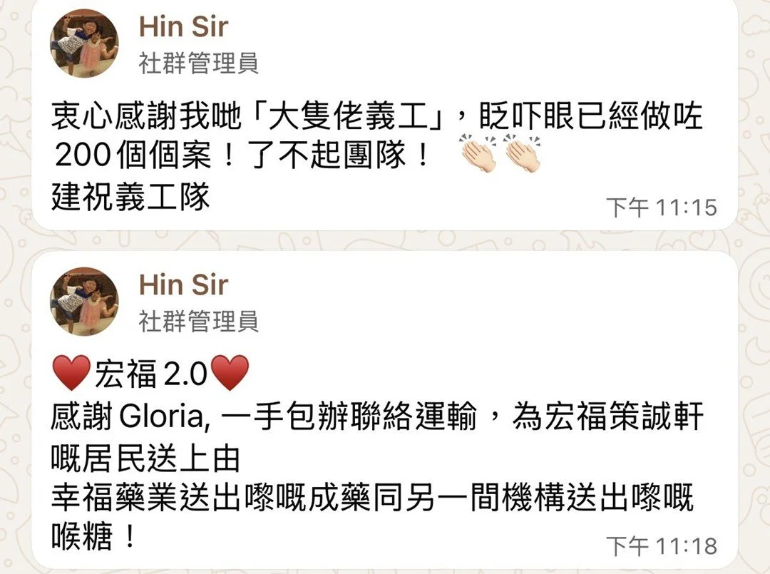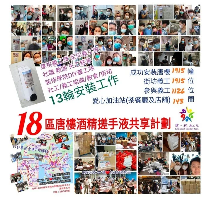 12. 「 唐樓搓手液計劃」: 超過1000位義工協助全港超過1900幢唐樓的樓梯地下安裝搓手液機,十多個無私奉獻的物資站,百多間的窩心加油站做refilling stations ,1900多位的唐樓「街坊義工」 協助管理 。