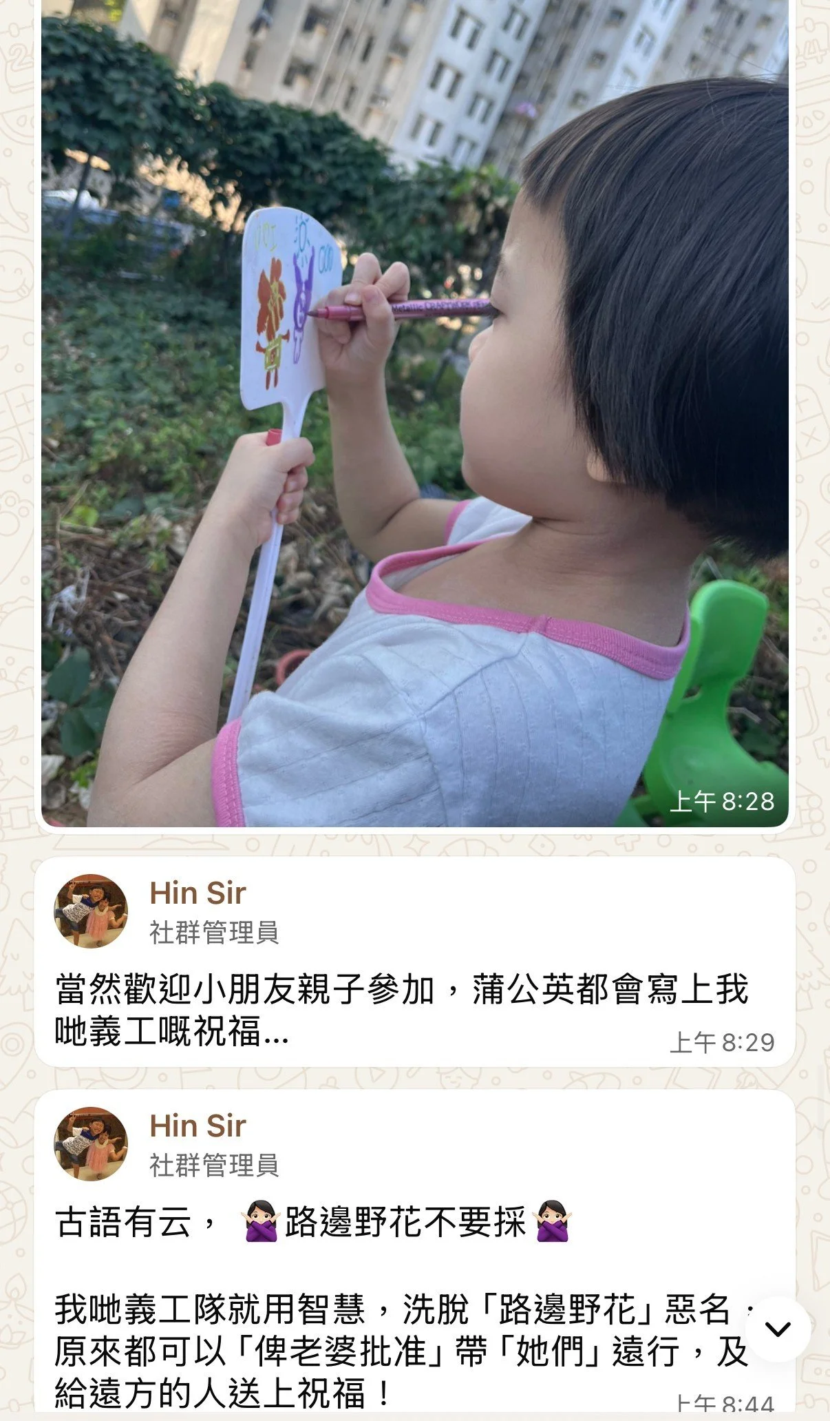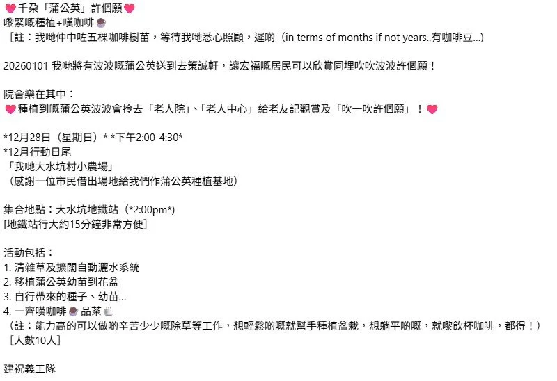 (註:能力高的可以做啲辛苦少少嘅除草工作,想輕鬆啲嘅就幫手種植盆栽,想躺平啲嘅,就嚟飲杯咖啡,都得!)