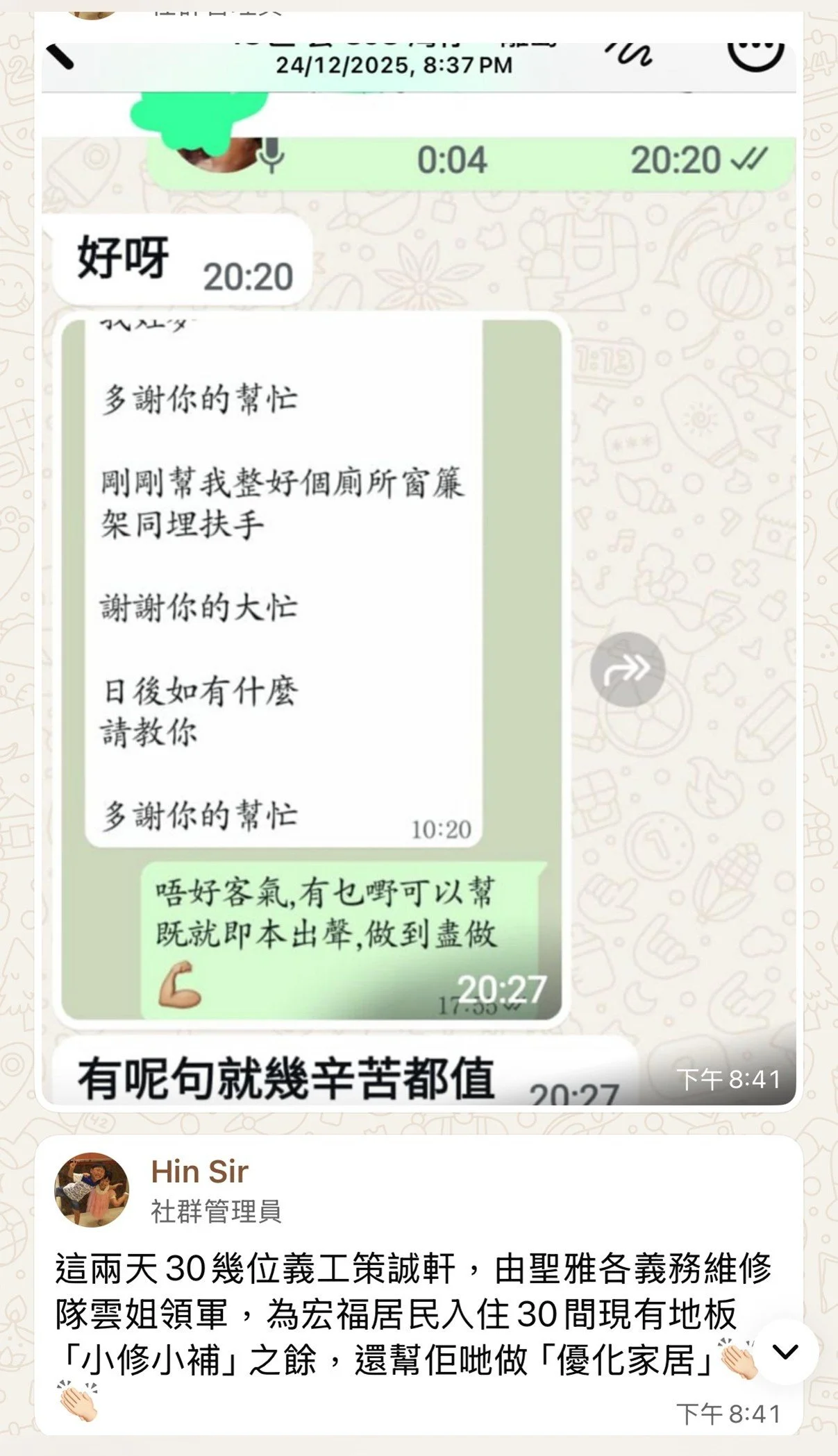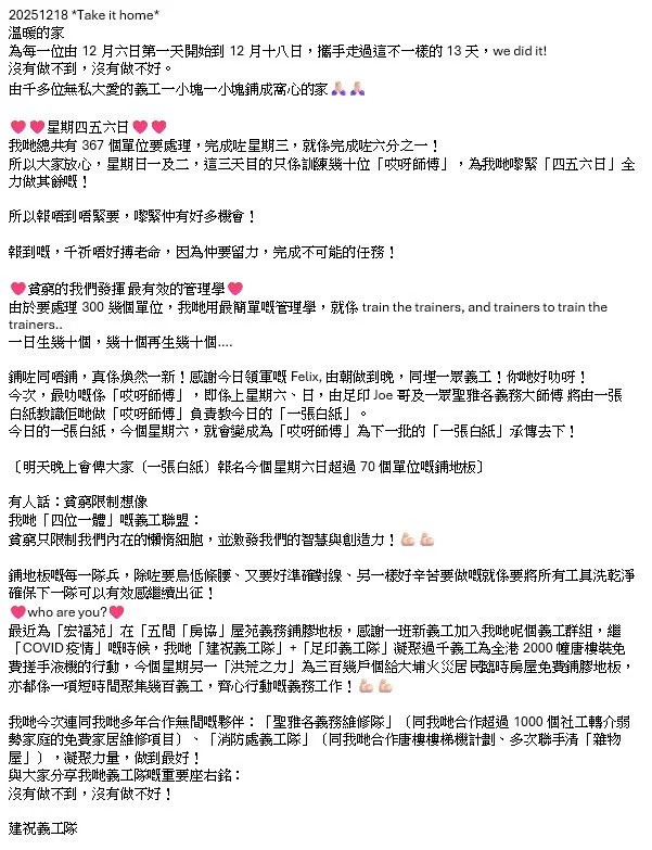 20251129 衷心感謝30幾位義工一齊努力,為大角咀79歲老伯伯一個安樂窩!