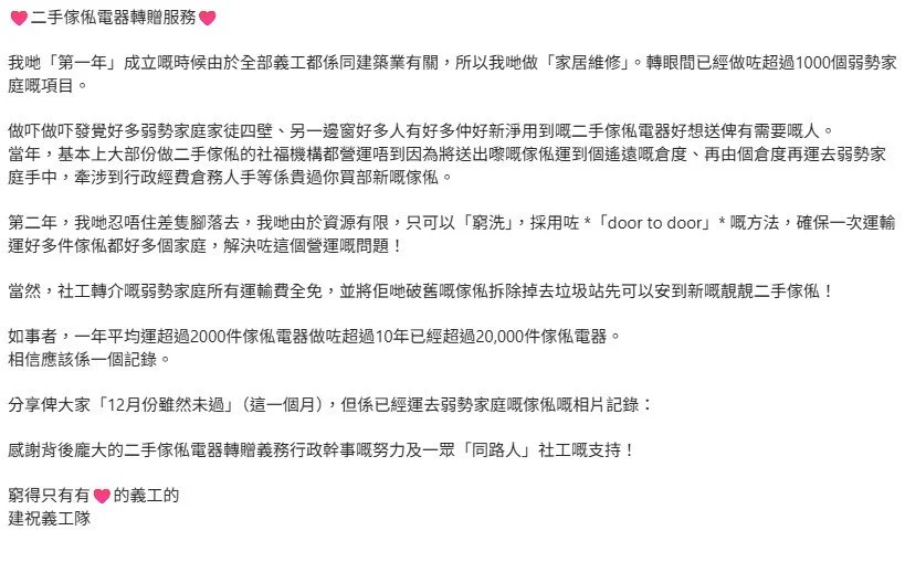 2.「二手傢俬轉贈服務」: 超過一百社福機構參與,累積超過18,871件免費家電連免運費安拆費送到弱勢社群家