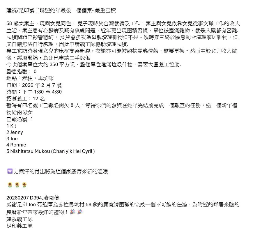 獨居洗腎長者,因病未能自理,家中長期欠缺執拾,加上因要在家中洗腎⋯每個月都需要一次過訂購多箱洗腎水儲在家中,因冷氣機在前壞了多時,但家中亂⋯師傅未能入內更換,另外床亦破舊,最近申請到基金購置新床,但床公司未能棄置舊床,長者現希望義工隊伸出援手⋯幫忙棄置舊床和儲物櫃,整理好家中雜物,騰出多些空間活動和讓師傅入內更換冷氣機!