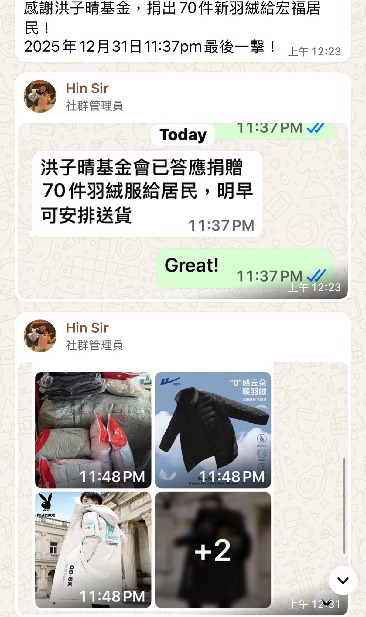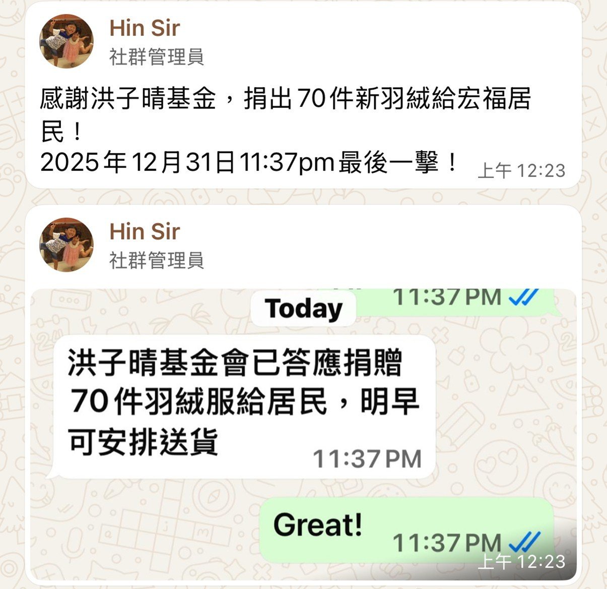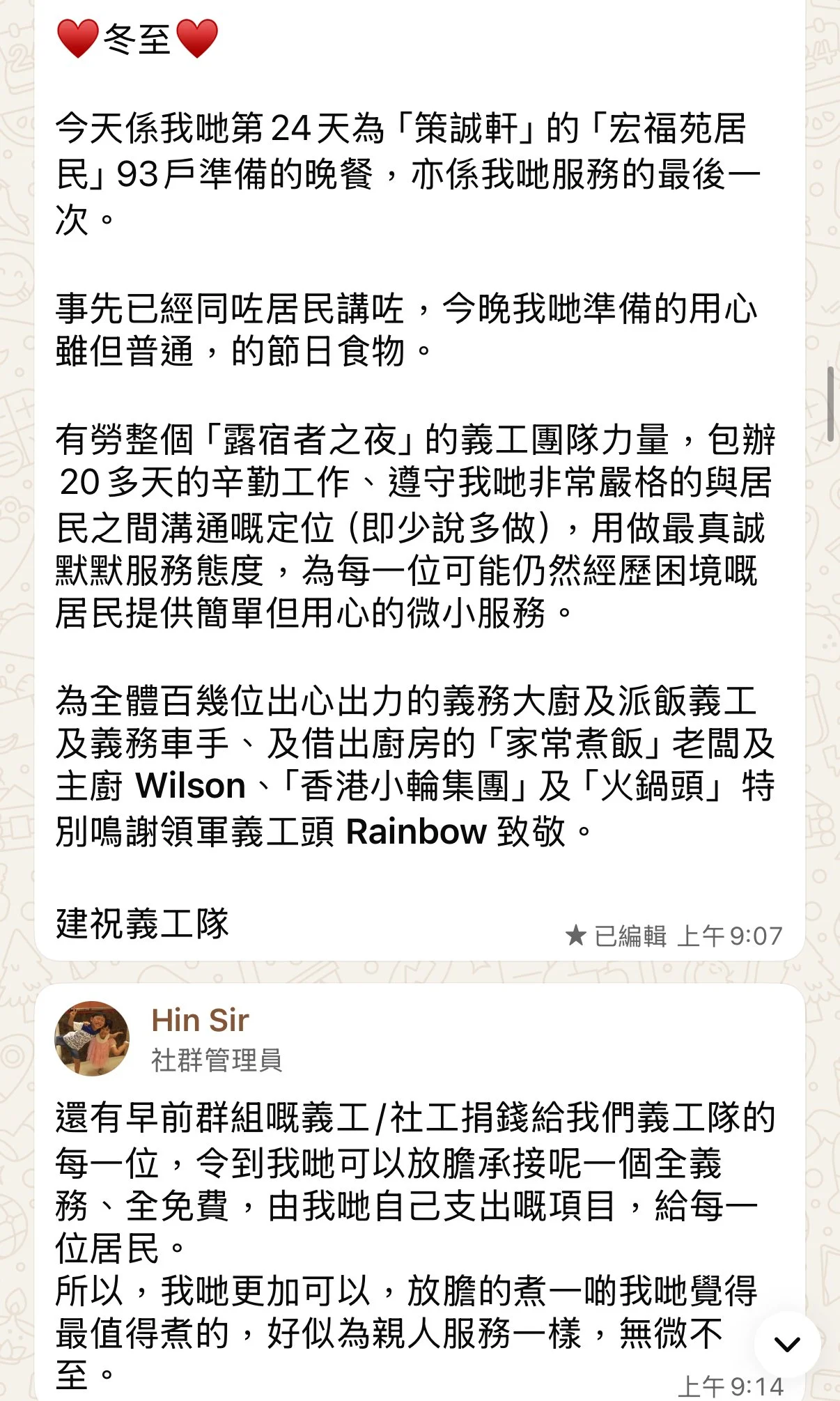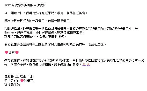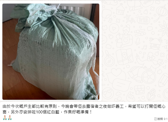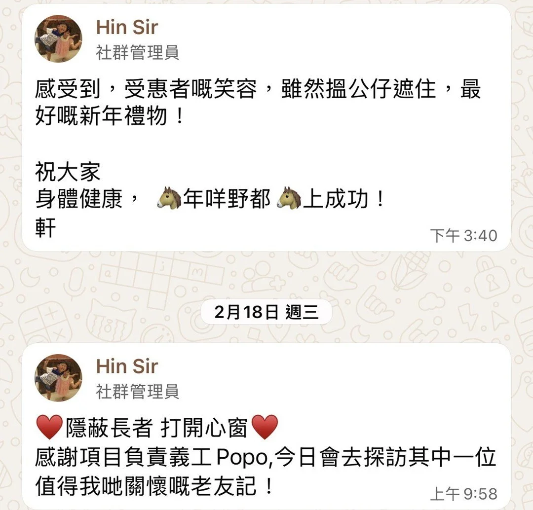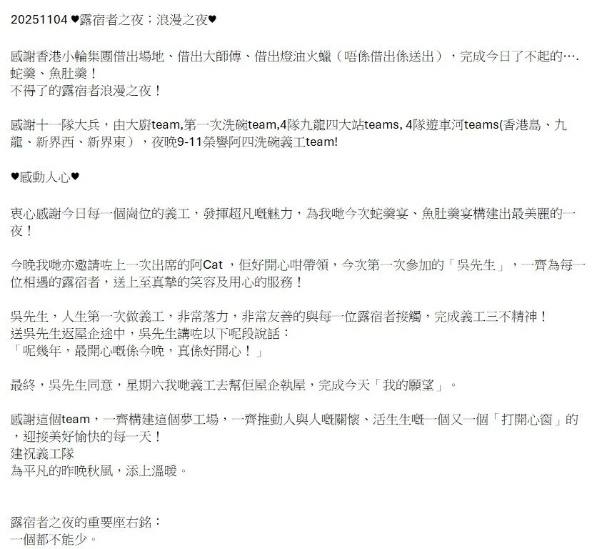 好開心見到全港九新界的350位露宿者分享佢哋嘅喜悅包括啲嘢食,同埋覺得已經大家係一個老朋友嘅感覺!