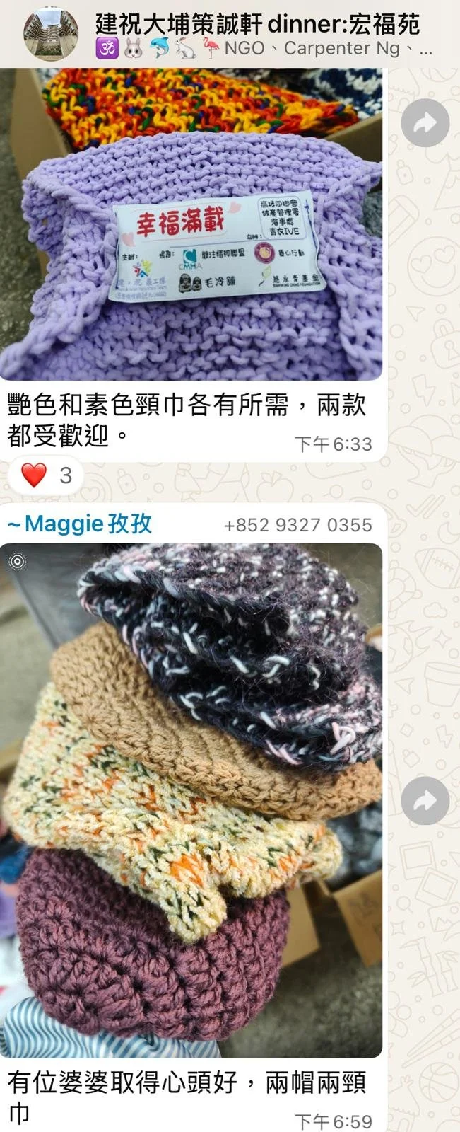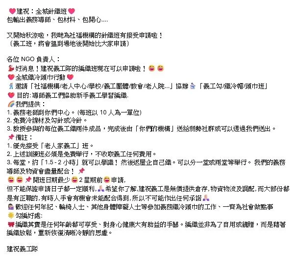 34. 全城織頸巾: 已經完成超過2000件冷頸巾送到不同社福機構,2025年開始織冷帽