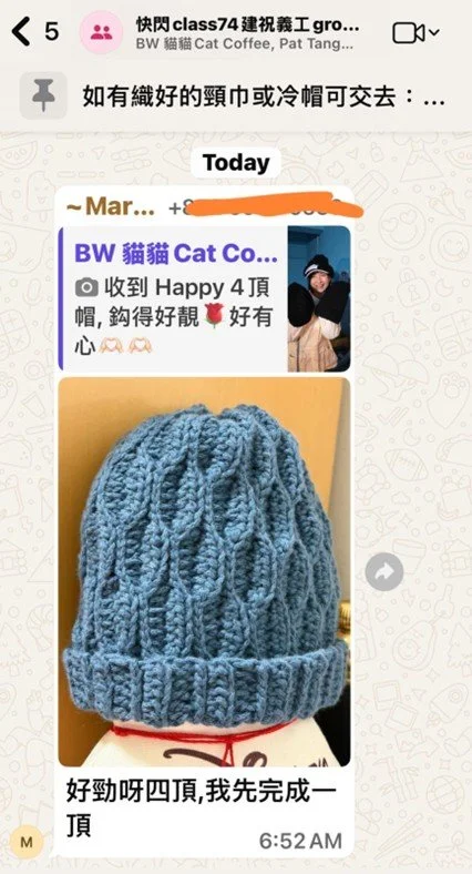 我哋第一年係織冷頸巾,第二年加咗冷帽!