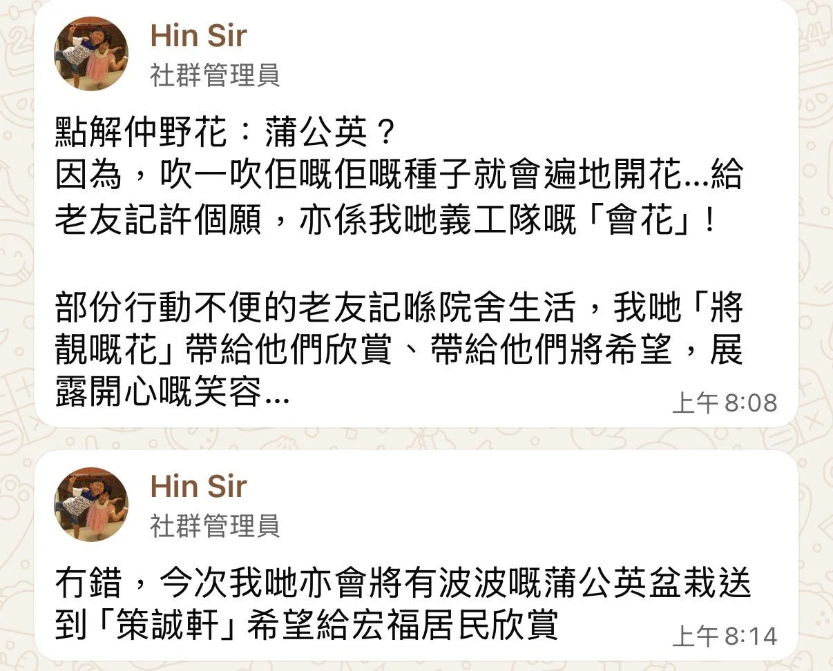 感謝幾位嘅義工,由我哋最初頭買「大棵苗」,到Richard博士成功嘗試自行種植,令到我哋開始買入「幼苗」(50棵$50!)及種子(感謝義工Sandy幫手,一啲都唔容易,要揀廣東省嘅確保嚟到香港唔會死),為我哋繼續輸出「種植好一個個波波的蒲公英」送到每一間老人院舍,為每一位老友記帶嚟希望…✨🌟⭐💫