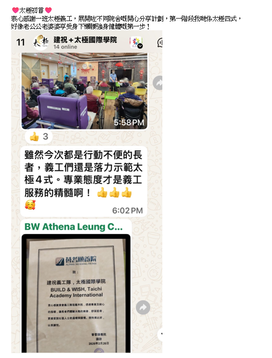 ♥️太極初嘗♥️衷心感謝一班太極義工,展開咗不同院舍嘅開心分享計劃,第一階段我哋係太極四式,好像老公公老婆婆享受身下懶腰強身健體嘅第一步!