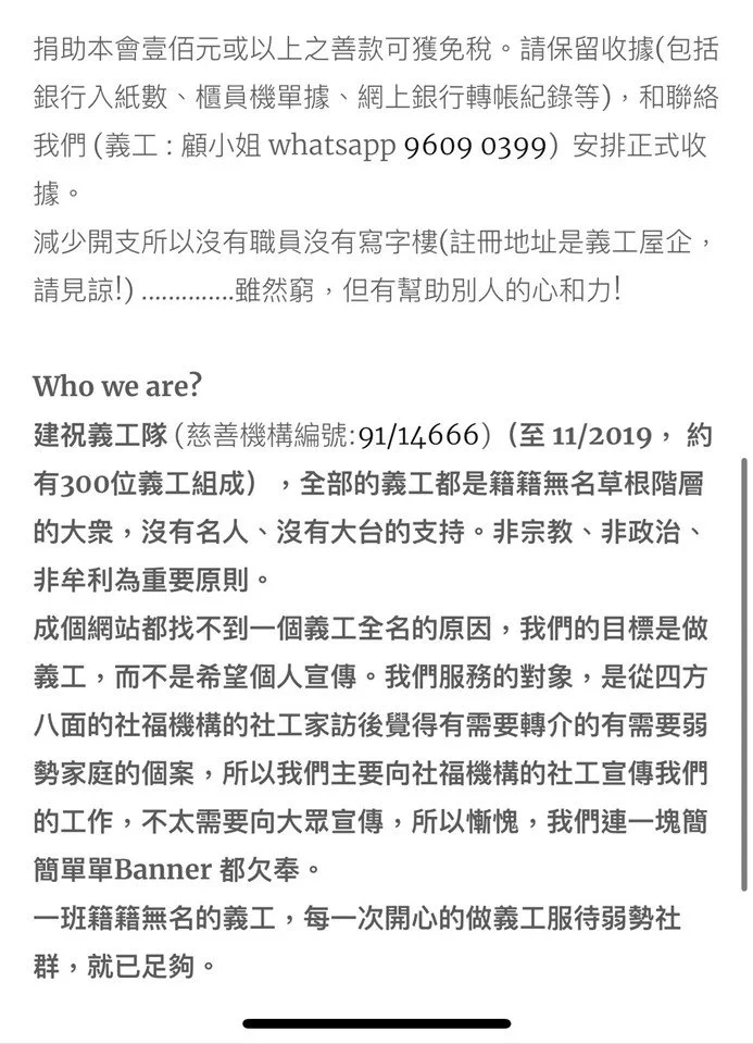 36. 施永青緊急扶危基金: 已經完成超過200份申請及成功審批85個家庭提供現金援助解決燃眉之急。嶄新的,希望透過二、三十位「義務社工」協助策劃、提供意見,及有空時輪流負責義務審批(每個個案審批由兩位獨立「義務社工」+ 1位建祝常任義工處理)等工作。