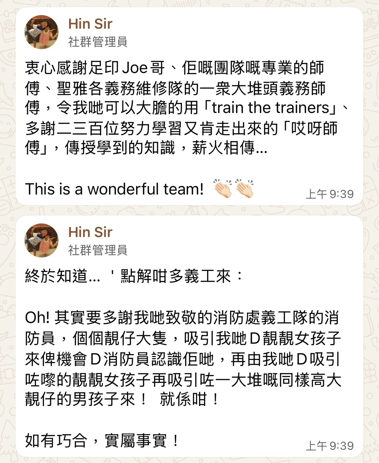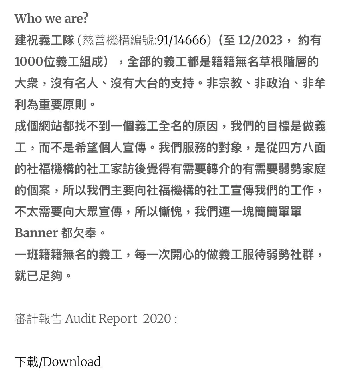 我哋義工隊做嘢真求求其其、是是旦旦、滾水淥腳,去到就得啦,過咗九年啦,我都從來冇一次真真正正寫低每一個項目的義務總幹事係邊個。
