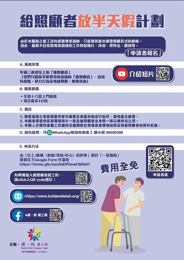 「社工/(社福機構/學校/中心/教會)的幹事」可以協助「照顧者」填寫google form報名上述服務: