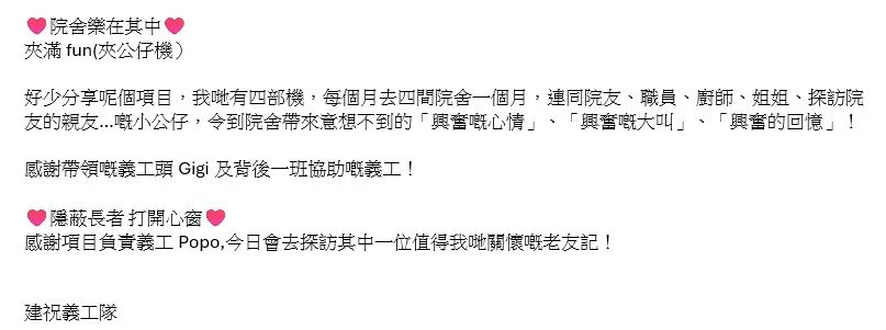 4. 建祝義工隊期望院舍由院友、院友家人、院長、職員、廚師、清潔等都可一齊享受玩夾公仔機嘅樂趣,並每人可獲公仔一個,不論是自己夾,或者其他人協助夾亦可。由於資源有限,每位院友或人士最多只可獲一個公仔,敬請原諒。希望院舍職員協助分配公仔,避免衝突。