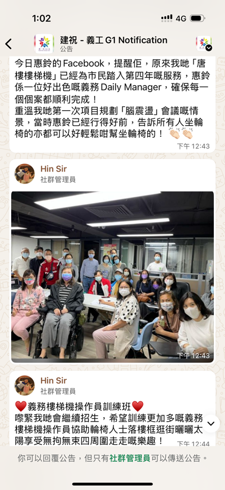 37. 建祝義工隊唐樓樓梯機計劃: 90次服務,為全港九新界唐樓輪椅人士免費由我哋合資格義務樓梯機操作員,與他們一起落樓,逛逛街,享受美好的一天!