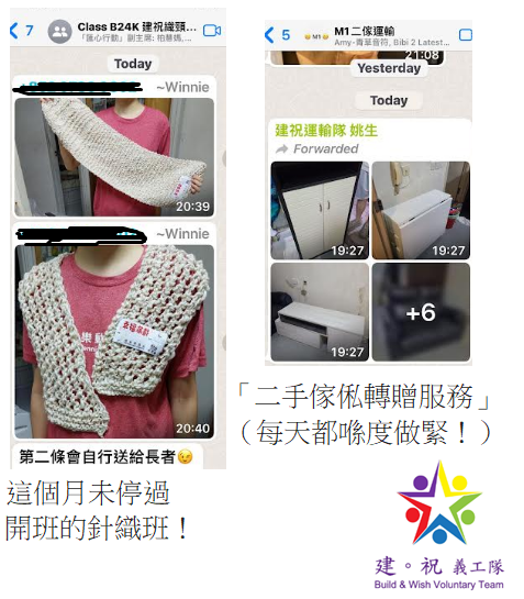 建祝義工隊/足印/社工互助 whatsapp 群組內超過六十個來自不同社福機構有心有力的社工/幹事默默地日夜不分做聯絡的工作,把有心人捐出但短時間內要搬走的二手傢俬電器透過建祝義工隊「二手傢私電器免費轉贈項目」送出有需要的弱勢社群。